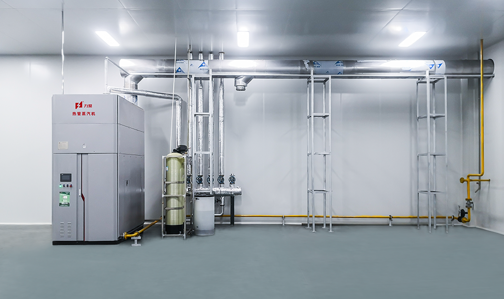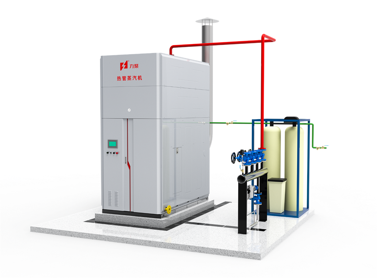 熱管蒸汽機是由蒸汽機本體及換熱器兩部分組成,蒸汽機本體產生一次側高壓蒸汽,通過汽水凝結換熱方式將熱量傳遞給二次側待加熱的冷水,一次側蒸汽凝結放熱后重新回到熱媒水中再加熱、汽化、如此循環往復。二次側冷水經由不銹鋼換熱器吸收一次側熱媒蒸汽的熱量后產生用戶所需壓力的蒸汽,對外輸出使用,可以根據項目需求產生潔凈蒸汽。