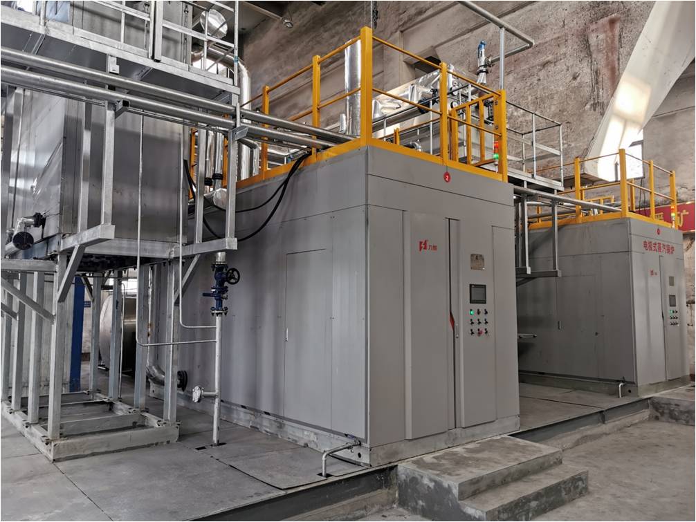 電極相變鍋爐是5001拉斯維加斯獨創的一種在鍋爐內部實現相變換熱的電極鍋爐。它主要由電極筒、介質筒、換熱器以及控制裝置組成。三相電極固定在電極筒內,浸在具有一定電導率的熱媒水中,三相電極通電后直接加熱熱媒水,在電流的作用下,熱媒水被迅速加熱汽化變成熱媒蒸汽,蒸汽上升到換熱器管外,將熱量傳遞給換熱器管內的冷水,對外輸出蒸汽。而熱媒蒸汽凝結成水滴回到熱媒水中重新被加熱汽化,完成整個循環。在機組運行中,熱媒水封閉在筒體內不斷地汽化-冷凝-汽化往復循環,實現電能向熱能的轉換。